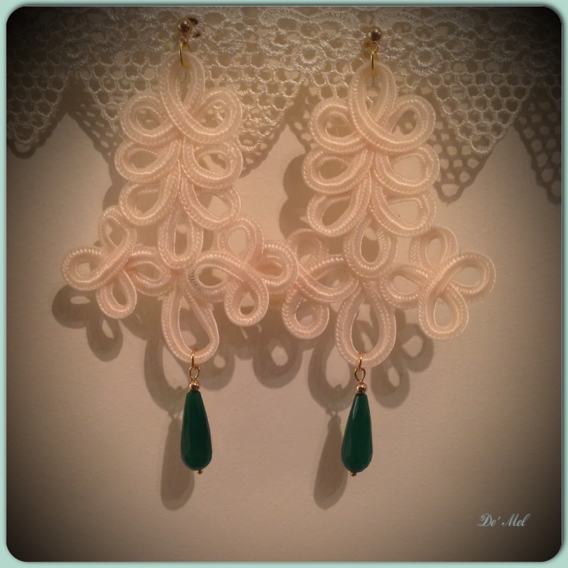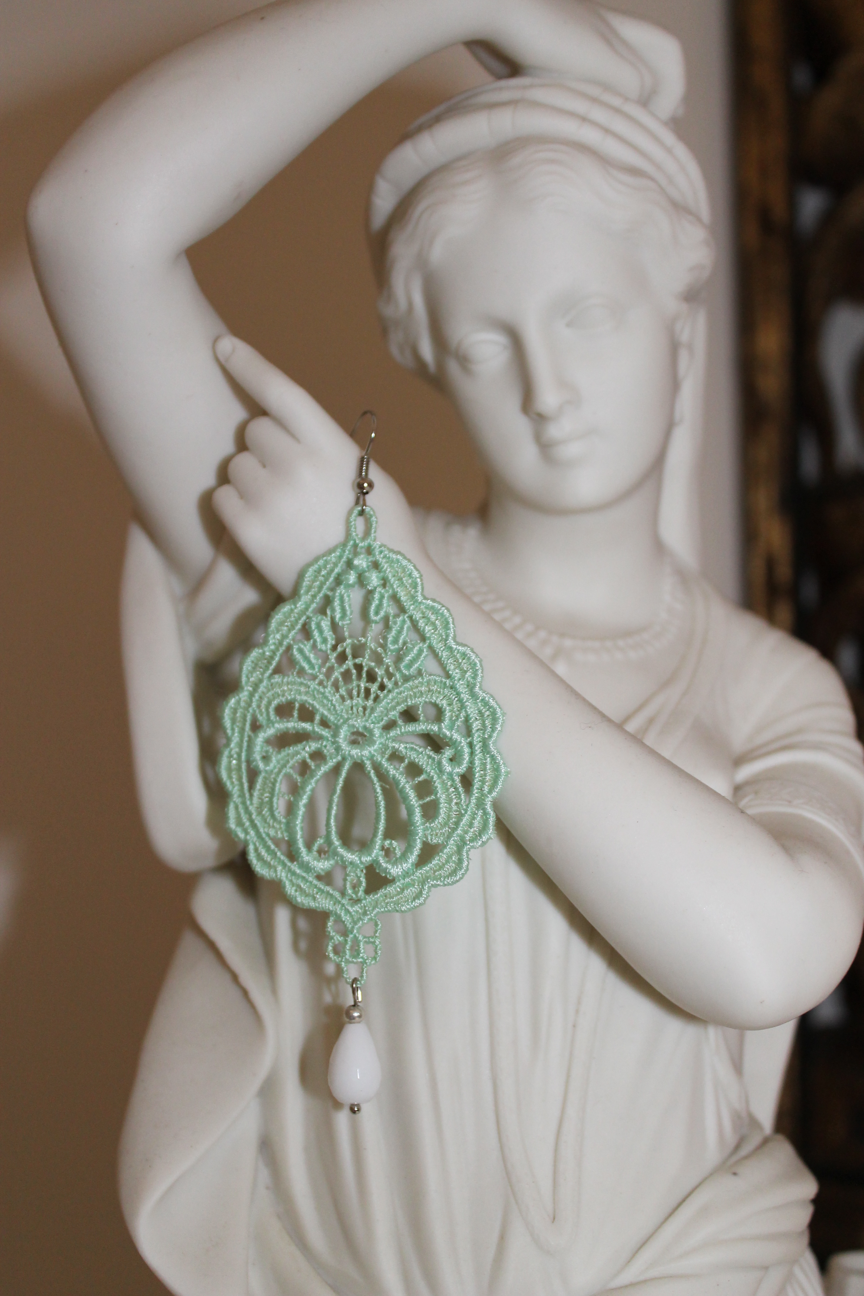 Mint green drop shape Venetian lace earrings with white agate (Semi- precious stone) and silver hardware