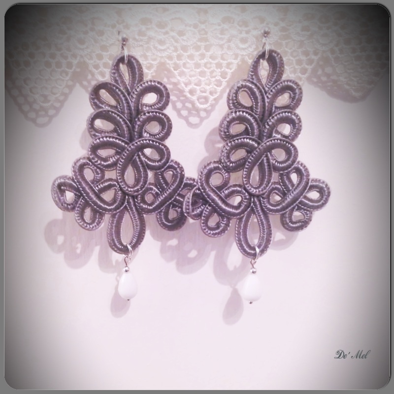 Pearl gray large Italian ornamental cord earrings with white agate and silver hardware