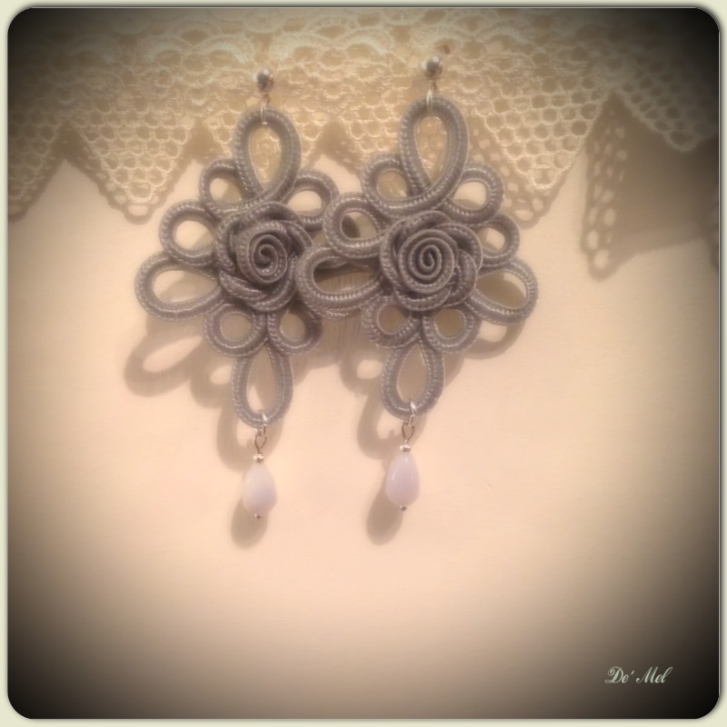 Light gray medium flower shape Italian ornamental cord earrings with ice blue chalcedony and silver hardware