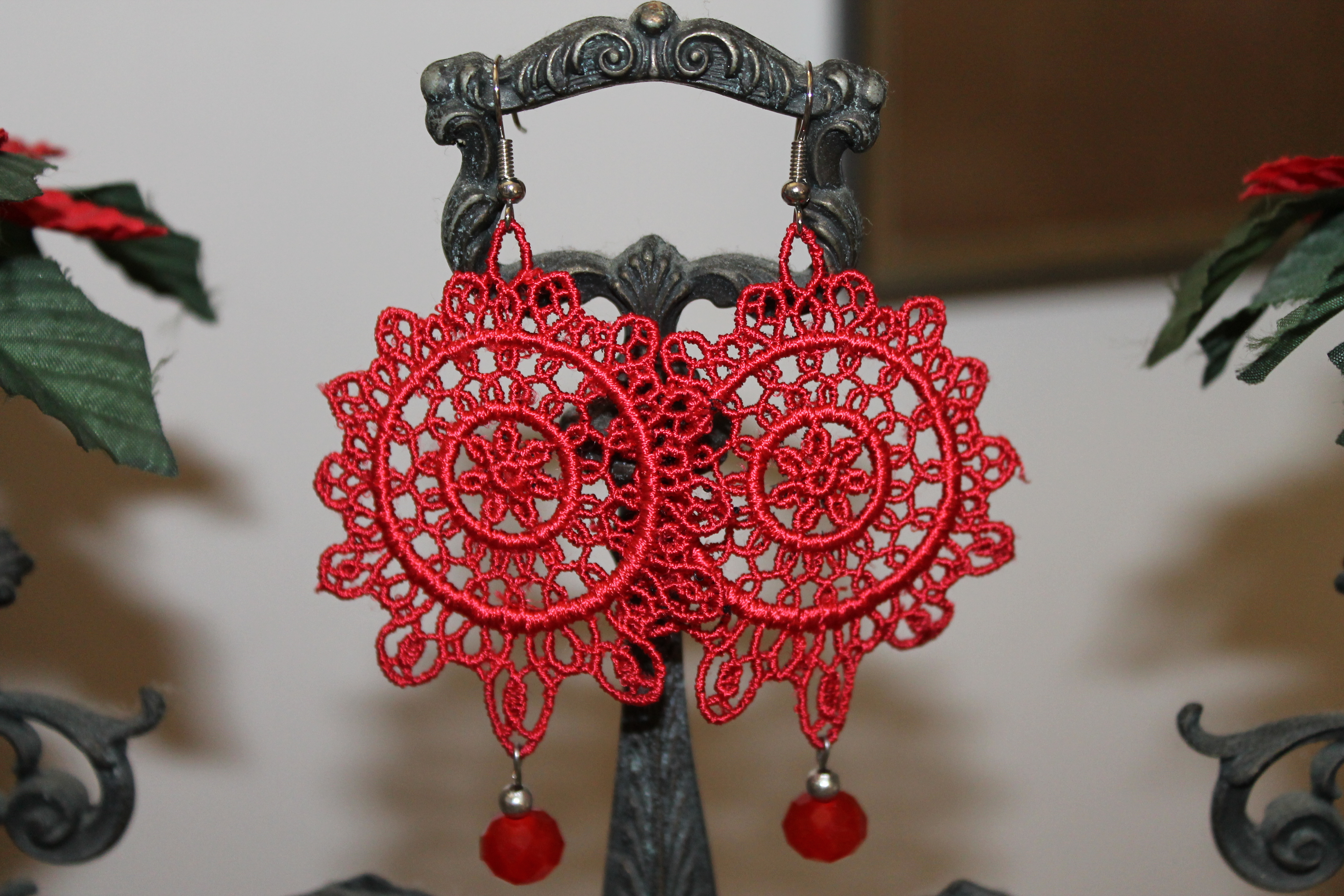 Passion red full-moon Venetian lace earrings with red swarovski crystal and silver hardware