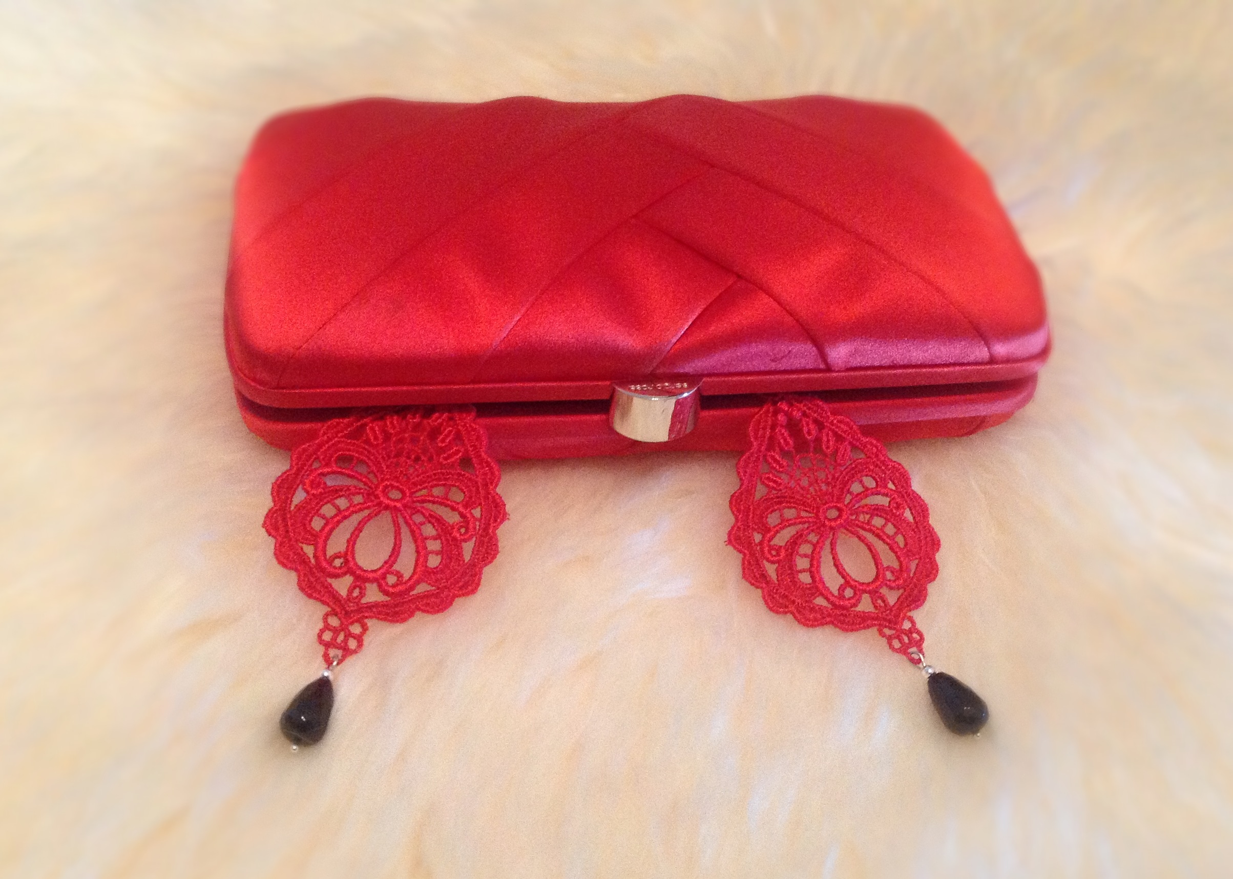 Passion Red drop-shape Venetian lace earrings with tear drop shape black onyx and silver hardware