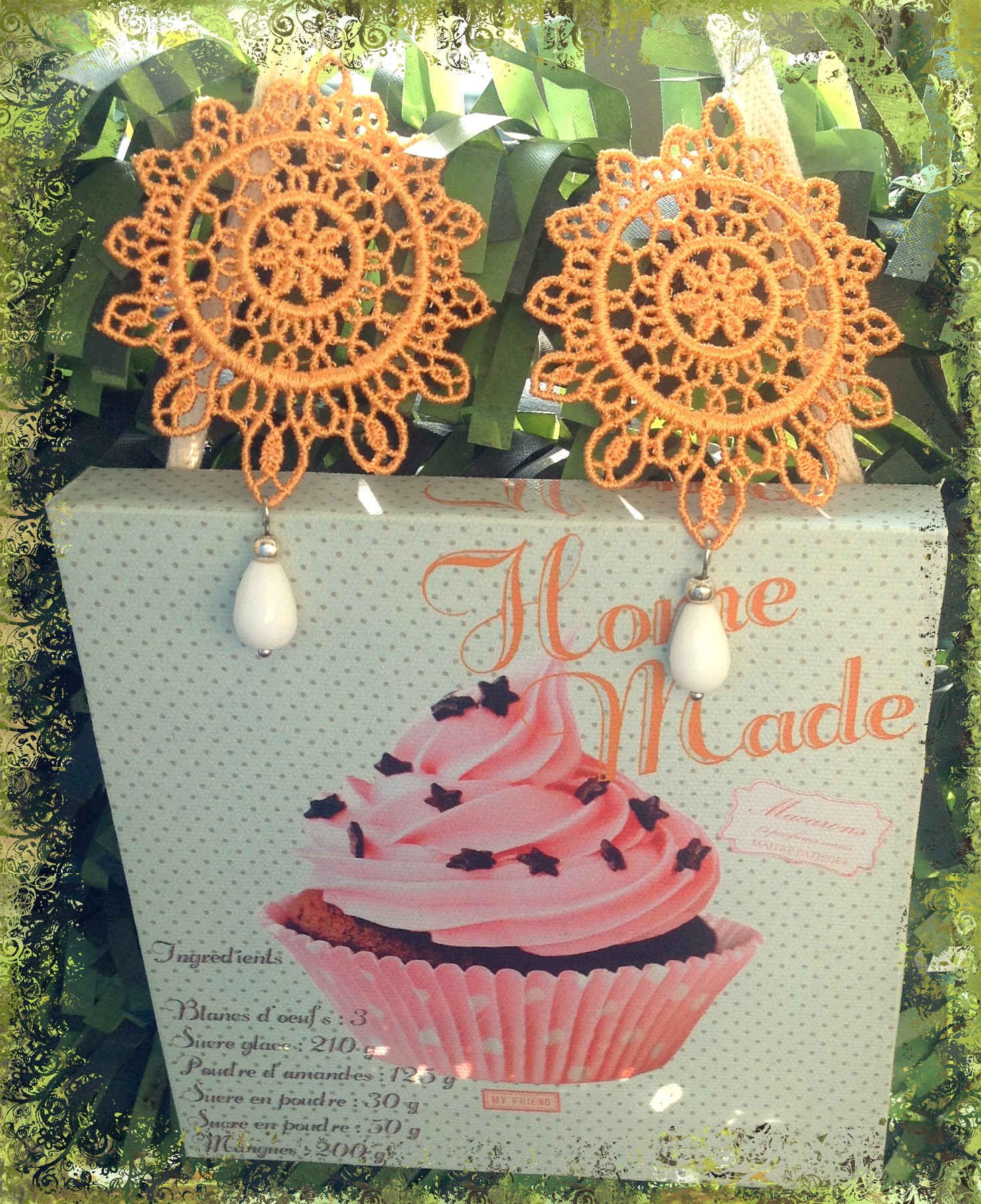 Tangerine drop shape Venetian lace earring with white agate (semi-precious stone) and gold hardware (nickel free)