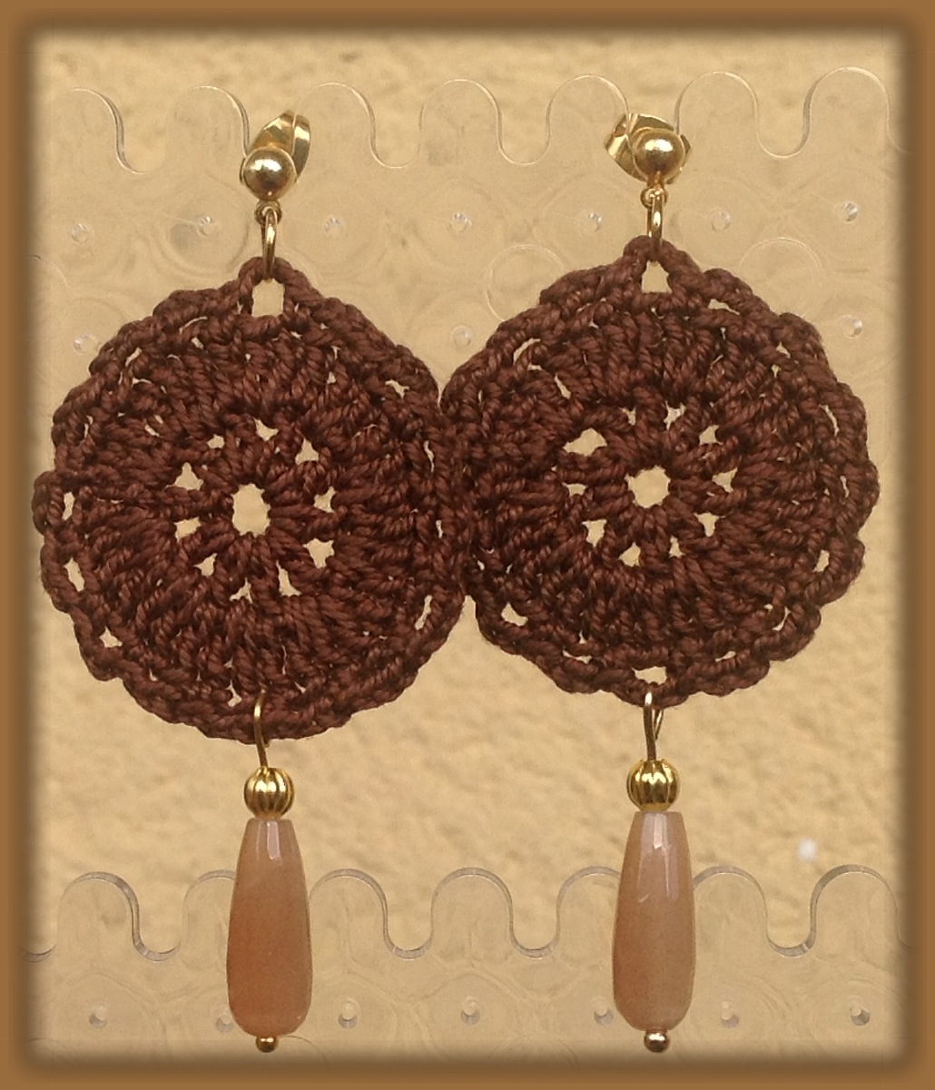 Coffee color medium hand-made crochet earrings with golden stone (semi-precious stone) and gold hardware