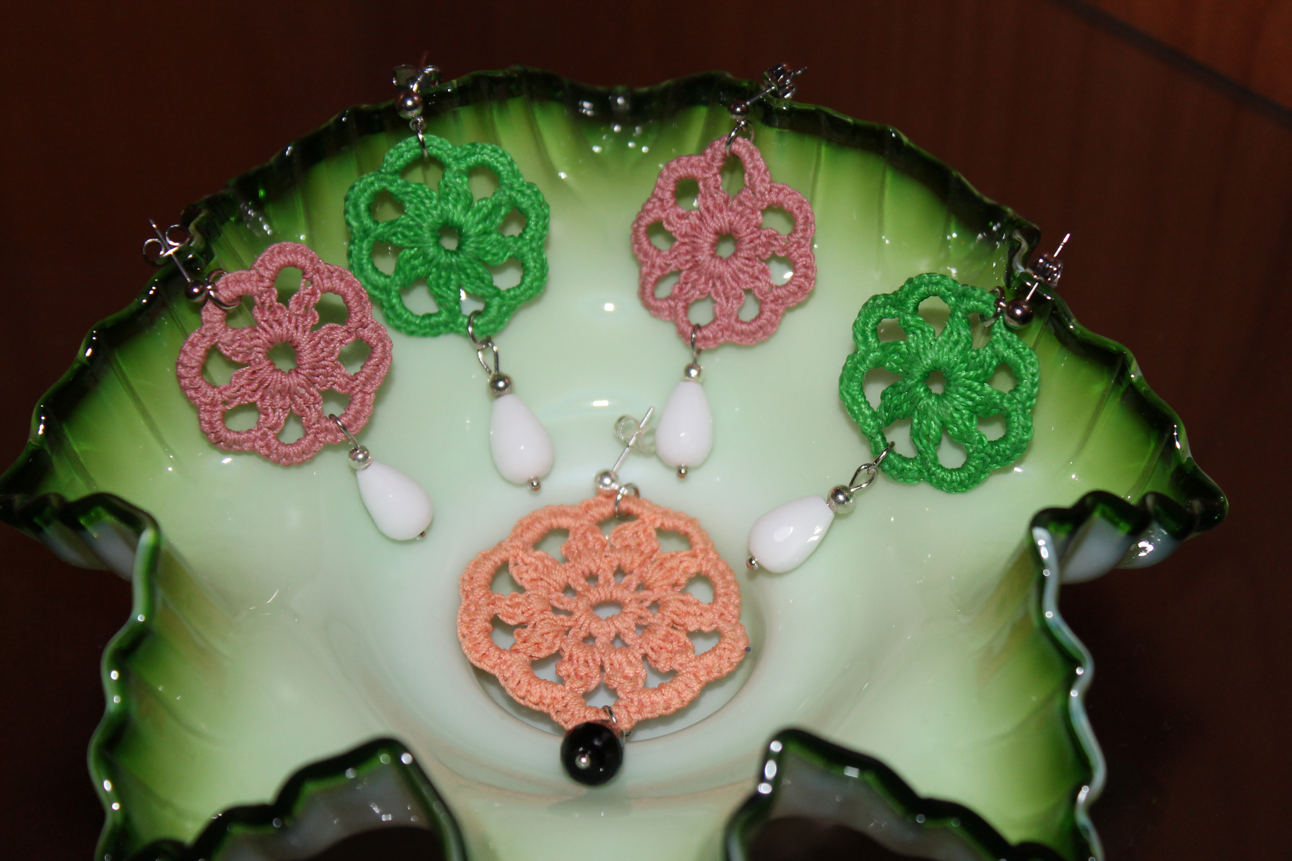 Emerald green hand-made crochet earrings with 925 sterling silver and opaque emerald