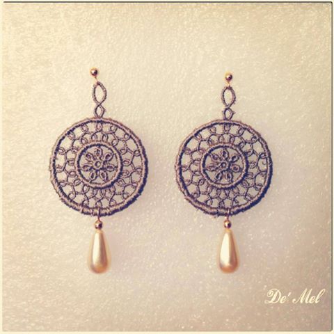 Round etoupe color Venetian lace earrings with synthetic drop shape pearl and gold hardware