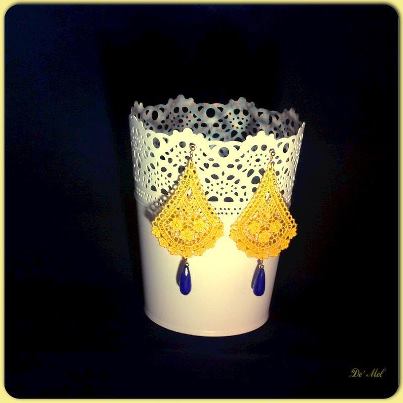 Yellow and blue…lemon color bell-shape Venetian lace earrings with opaque Safire and gold hardware