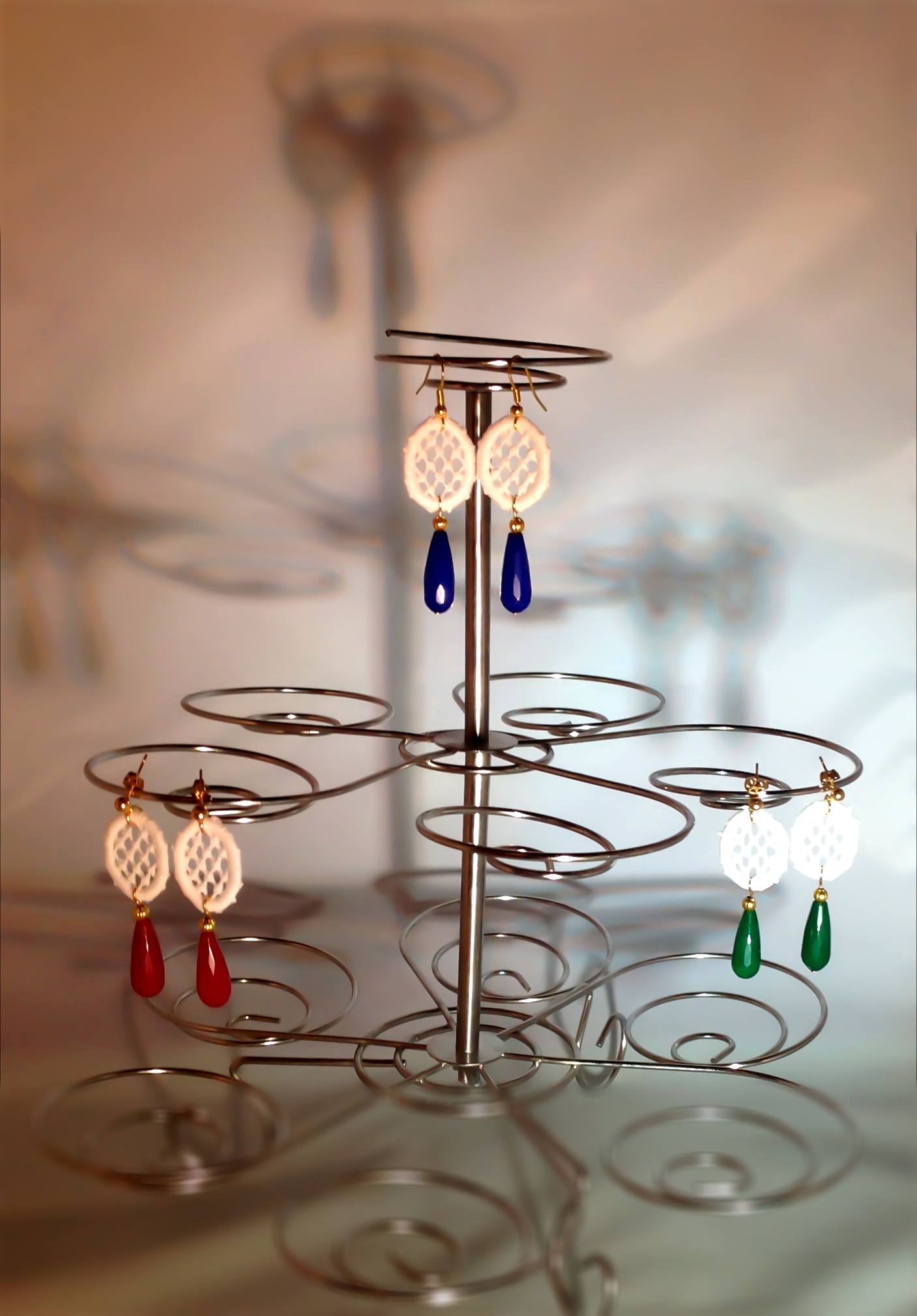 Small white Venetian lace earrings with 3 variations of stone: opaque Ruby, opaque Safire and opaque Emerald
