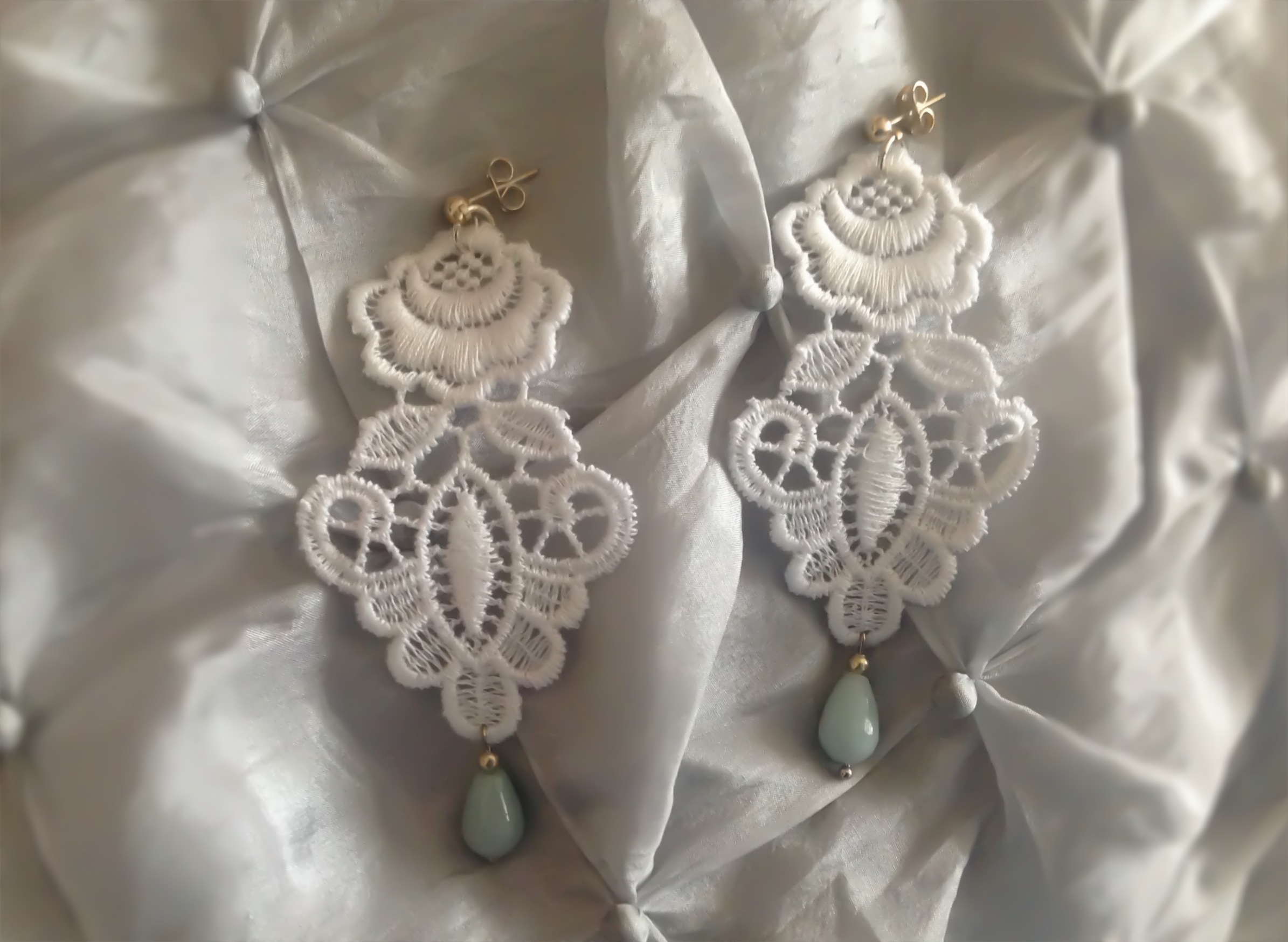 Medium white Venetian lace earrings with ice blue chalcedony (semi-precious stone) and silver hardware