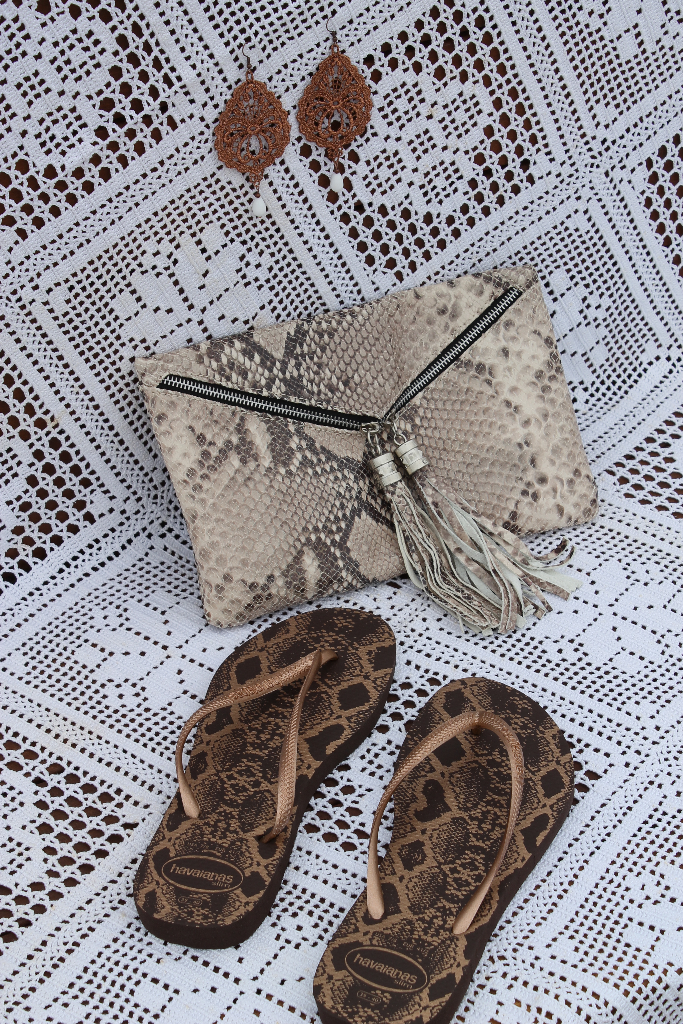 De’ Mel Copper color drop-shape earrings with Python clutch and Summer 2013 Hawaianas collection