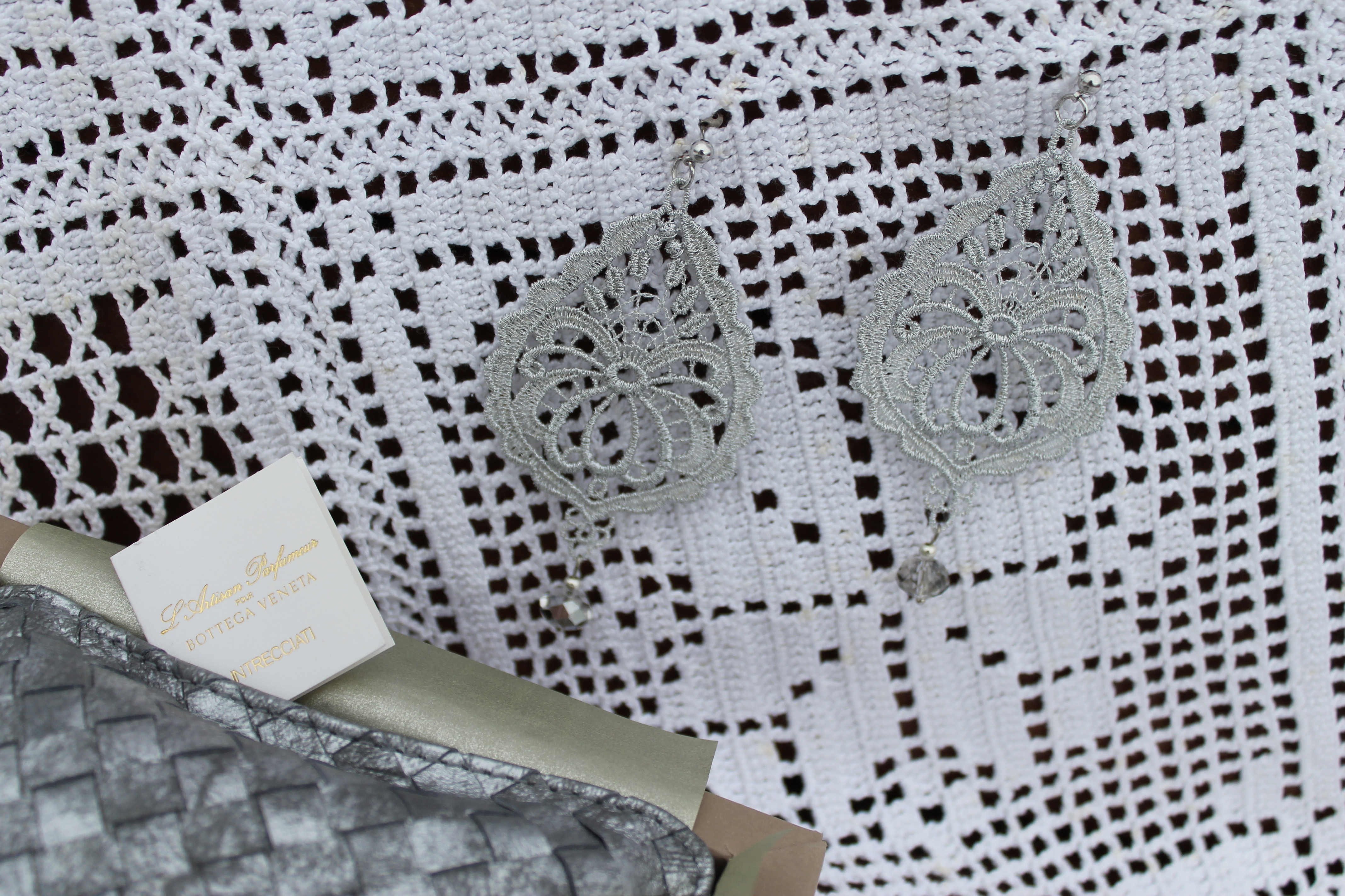 Silver drop shape Venetian lace earrings with swarovski crystal and silver hardware here with Bottega Veneta perfumed silver pouch
