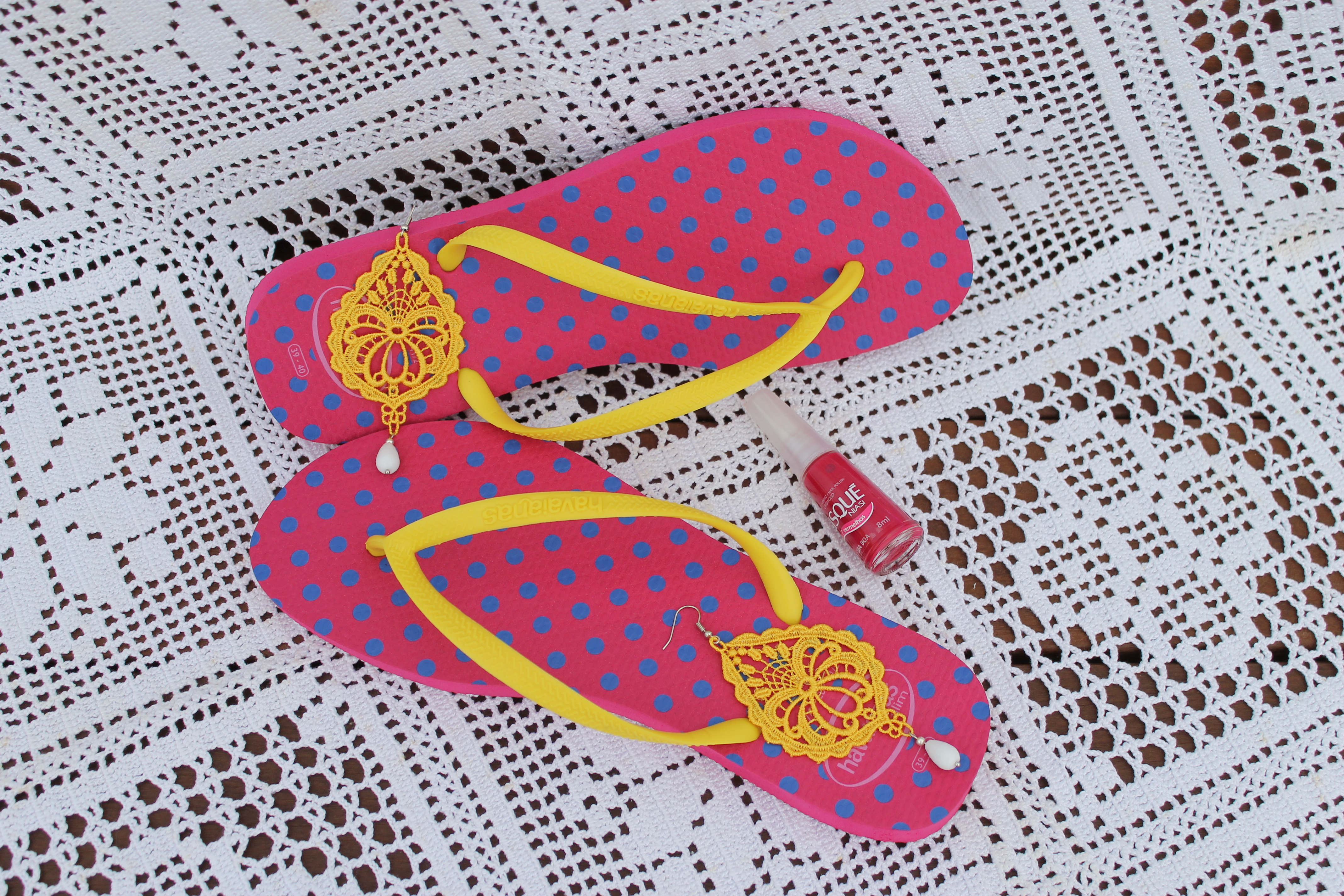 Lemon drop-shape Venetian lace earrings with white Agate (semi-precious stone) and silver hardware here with Hawaianas summer 2013 collection and pink Risque nail polish