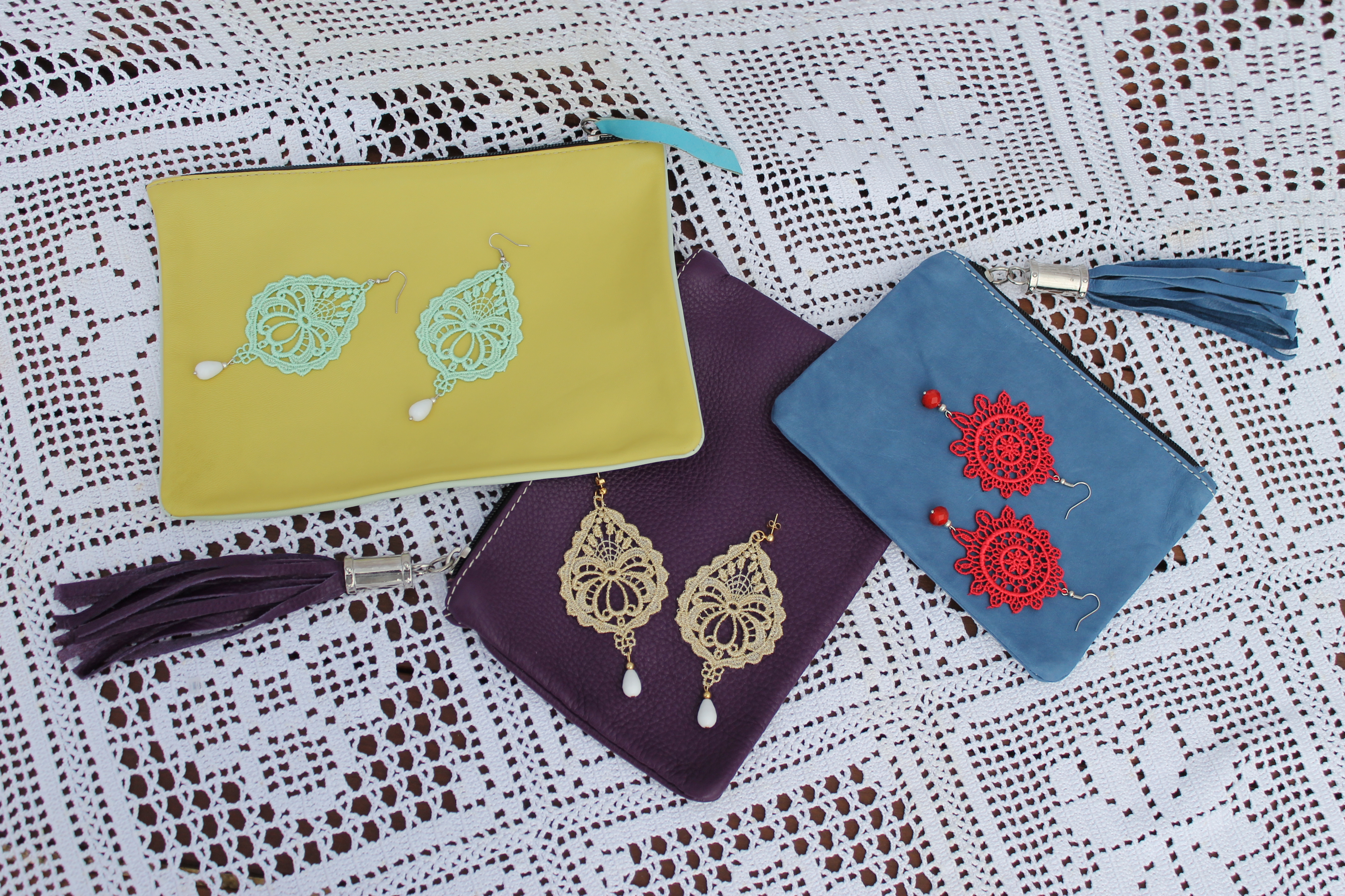 Multicolor Venetian lace earrings with multicolor clutches!