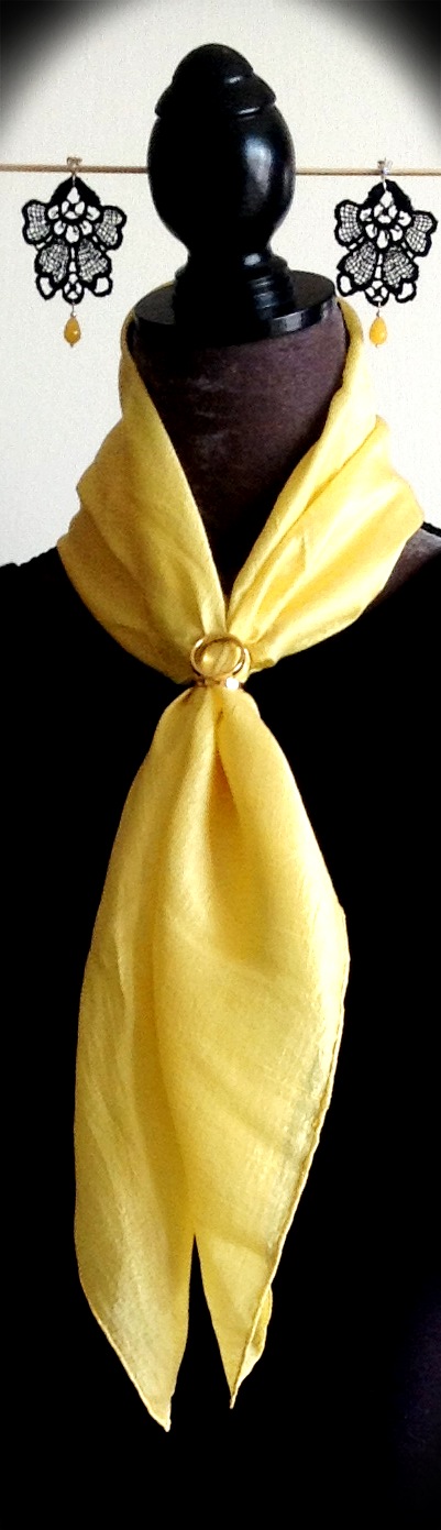 Black medium size Venetian lace earrings with yellow quartz and silver hardware here with vintage yellow silk scarf and Hermes scarf ring