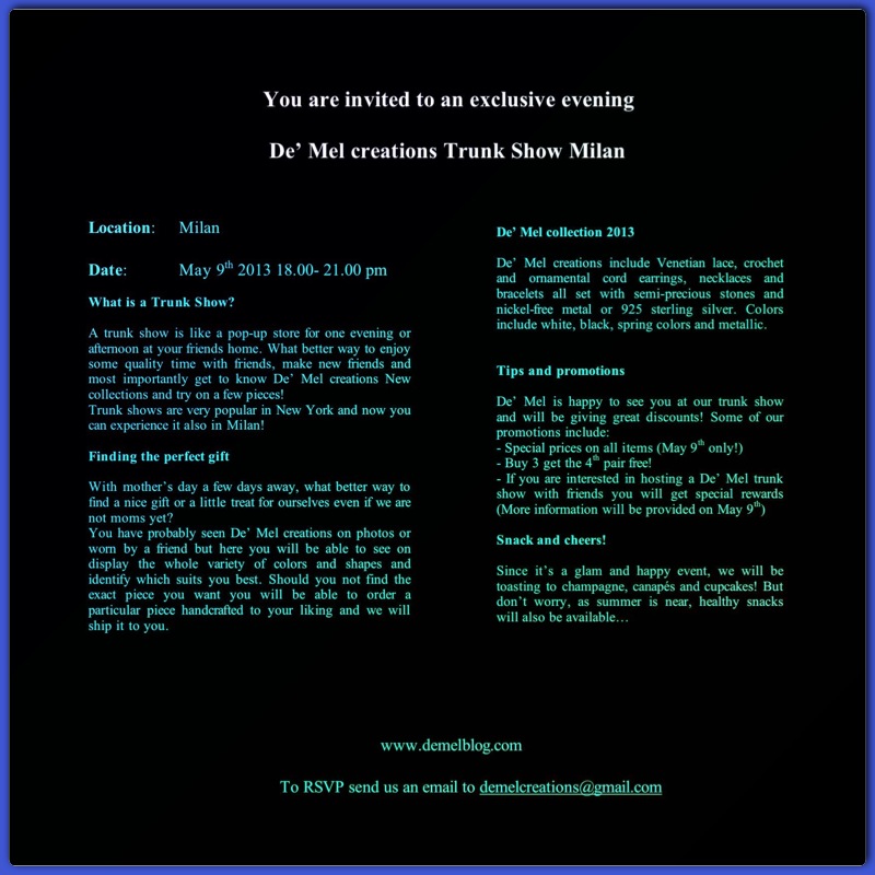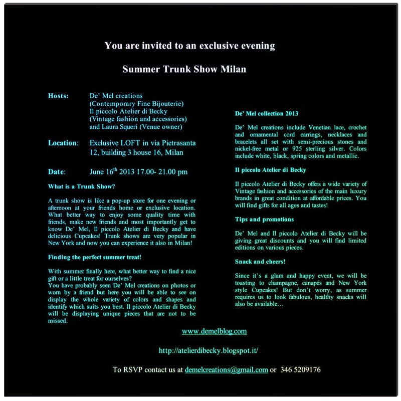 With Summer finally here and after the success of our first De’ Mel Trunk Show in Milan, we decided have a “Summer” Trunk Show on June 16th so that our fans could attend and have a look at our Summer collection and meet and network with new people and friends.