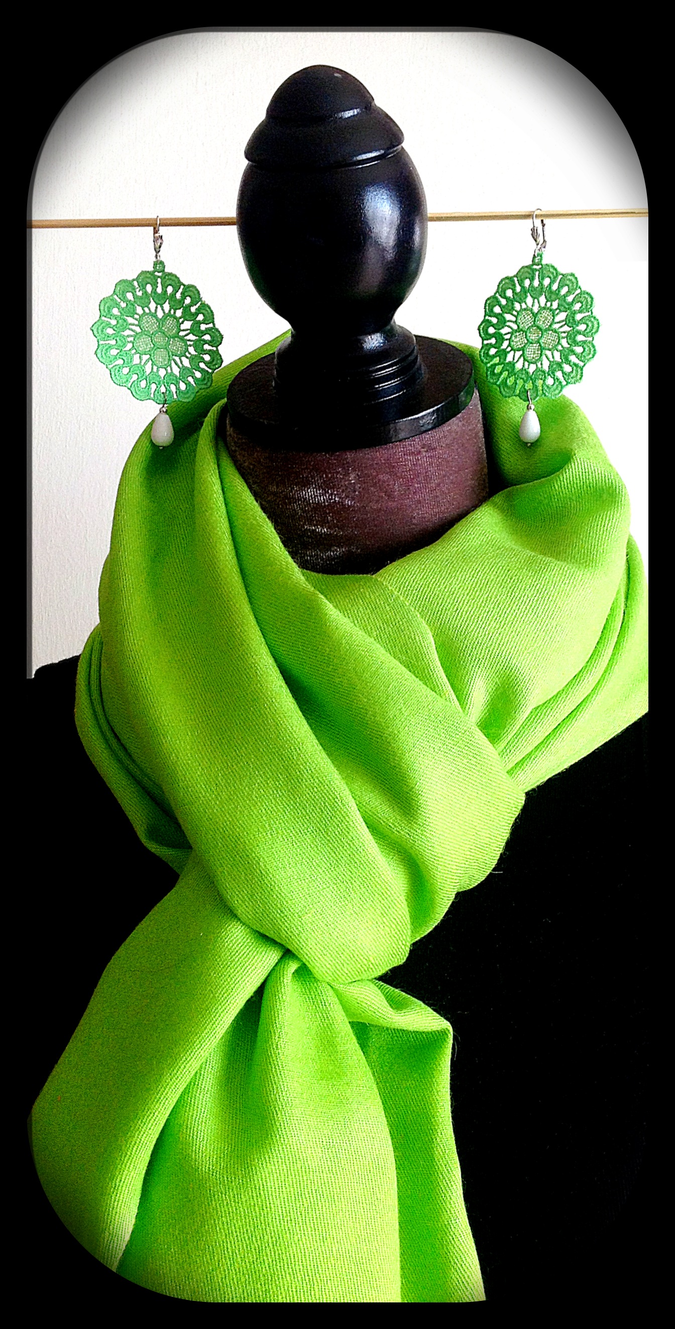 Today I want to share with you this pair of Fluo-green Venetian lace earrings. Fluo is so hot this SS13. This pair is medium size and has white agate (semi-precious stone) and silver hardware combined with a matching Fluo-green silk-cashmere shawl ❤Image